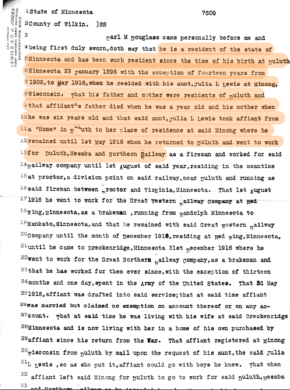 State of Minnesota, Soldier’s Bonus Board, WWI Bonus File and Documents for Earl Mack Douglas, Warrant File no. 73717 (St. Paul, MN, 1919), affidavit of Julia L. Lewis, [date if shown], [page or image number].
