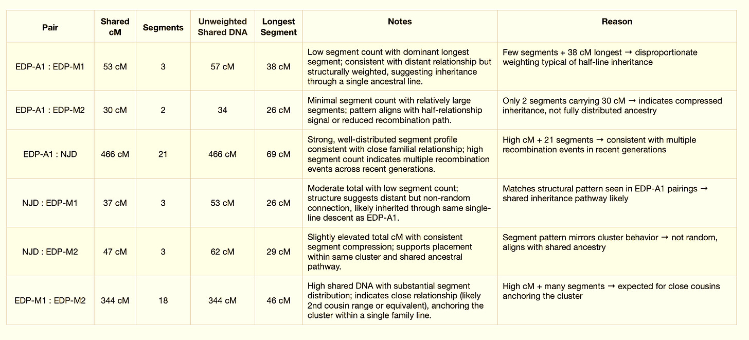 The DNA evidence resolves into a pattern consistent with half-relationship structures. The signal is not diffuse. It is concentrated. Total shared DNA falls within moderate ranges, segment counts remain low, and the longest segments carry disproportionate weight. This is not the architecture of a full ancestral pair. It is the signature of a single-line descent.